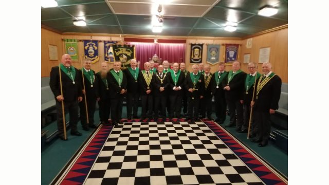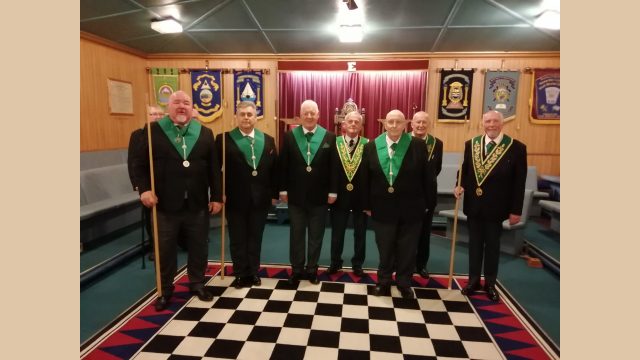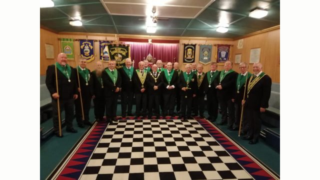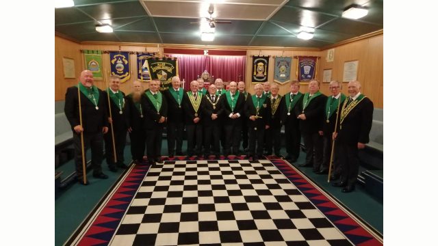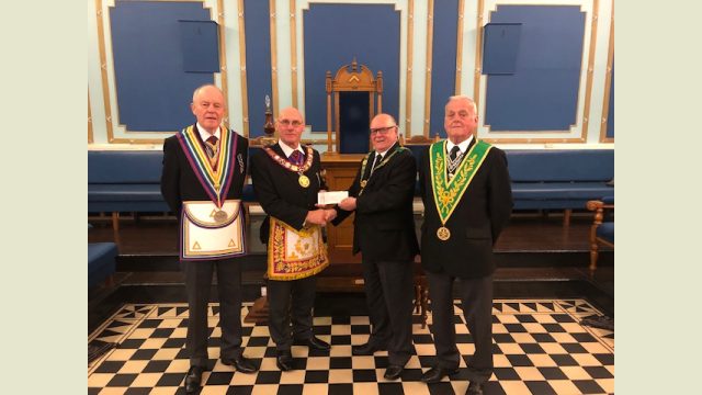 Picture – Gary Horstman the Provincial Grand Master of the Cheshire Mark Province accompanied by Austin Bamber his Deputy receiving the cheque from Peter Talbot the District Grand Prefect and his Deputy David Wright of the Allied Masonic Degrees on 14th May 2022 at Joppa RAM meeting.”